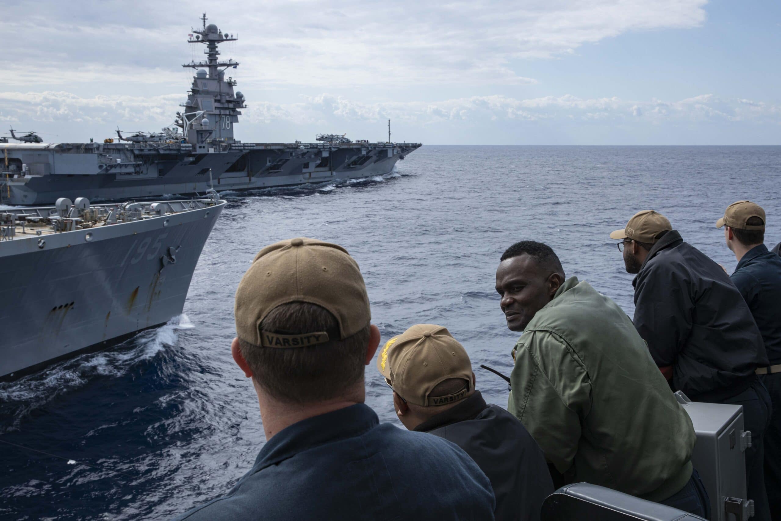 230503-N-LK647-1143 ATLANTIC OCEAN (May 3, 2023) Capt. Errol Robinson, commanding officer, USS Normandy, third from left, and crew members assigned to the Ticonderoga-class guided missile cruiser USS Normandy (CG 60) watch from the bridge wing as the first-in-class aircraft carrier USS Gerald R. Ford (CVN 78) conducts a training emergency breakaway from the Henry J. Kaiser-class replenishment oiler USNS Leroy Grumman (T-AO 195) following a replenishment-at-sea, May 3, 2023. The Gerald R. Ford Carrier Strike Group (GRFCSG) is conducting a scheduled deployment in the Atlantic Ocean. The GRFCSG provides an inherently flexible naval force capable of deploying across combatant commands to meet emerging missions, deter potential adversaries, reassure allies and partners, enhance security and guarantee the free flow of global commerce. (U.S. Navy photo by Mass Communication Specialist 2nd Class Malachi Lakey)